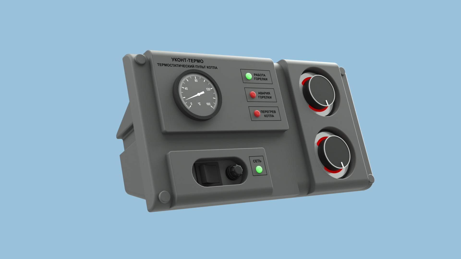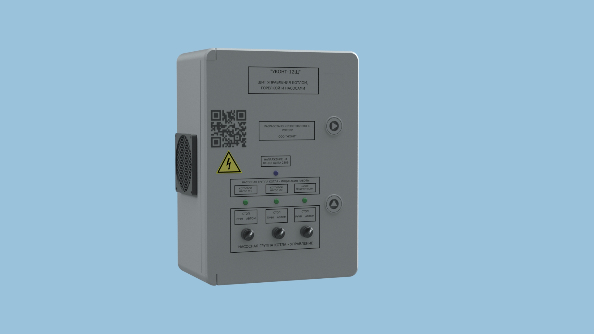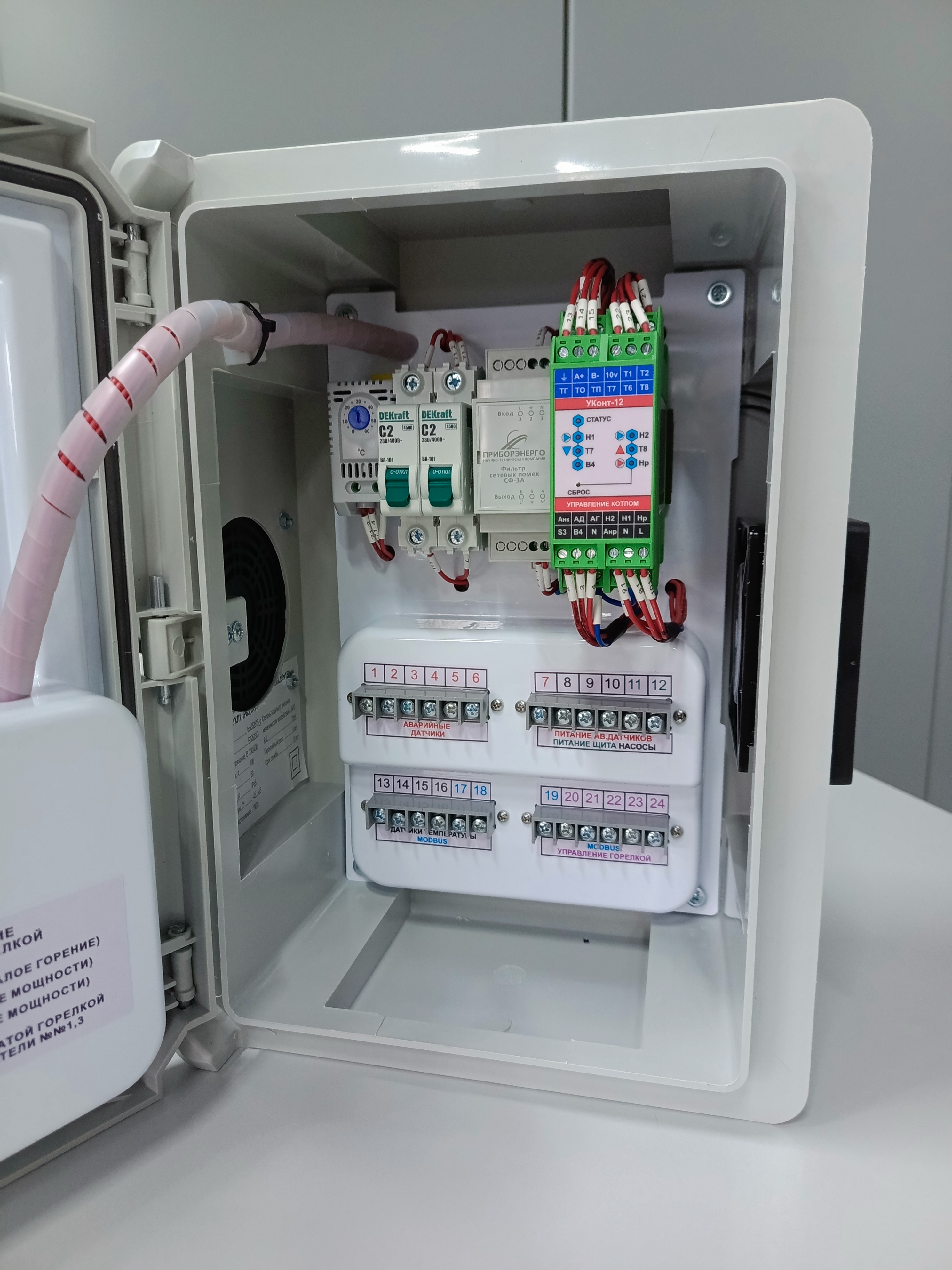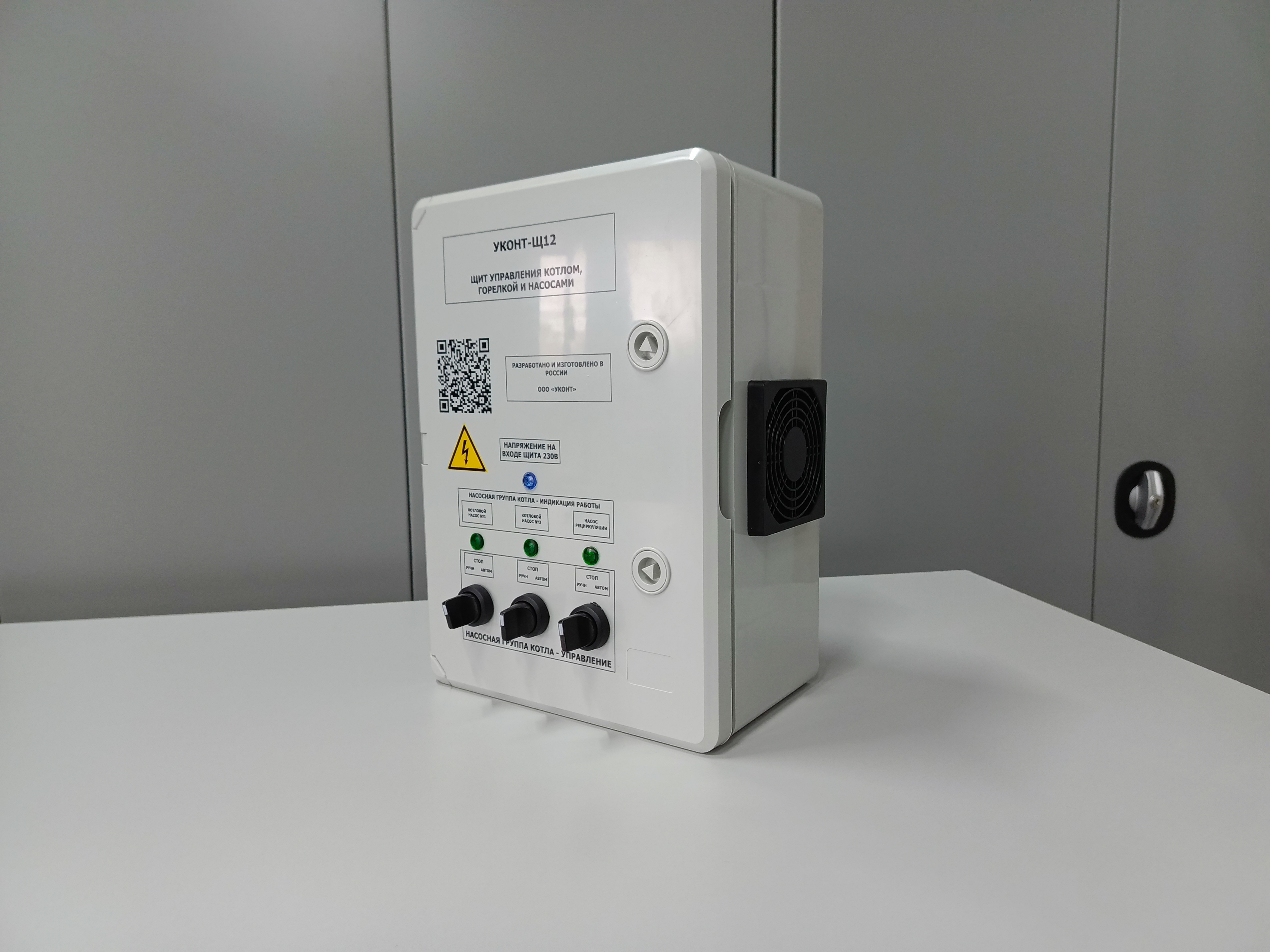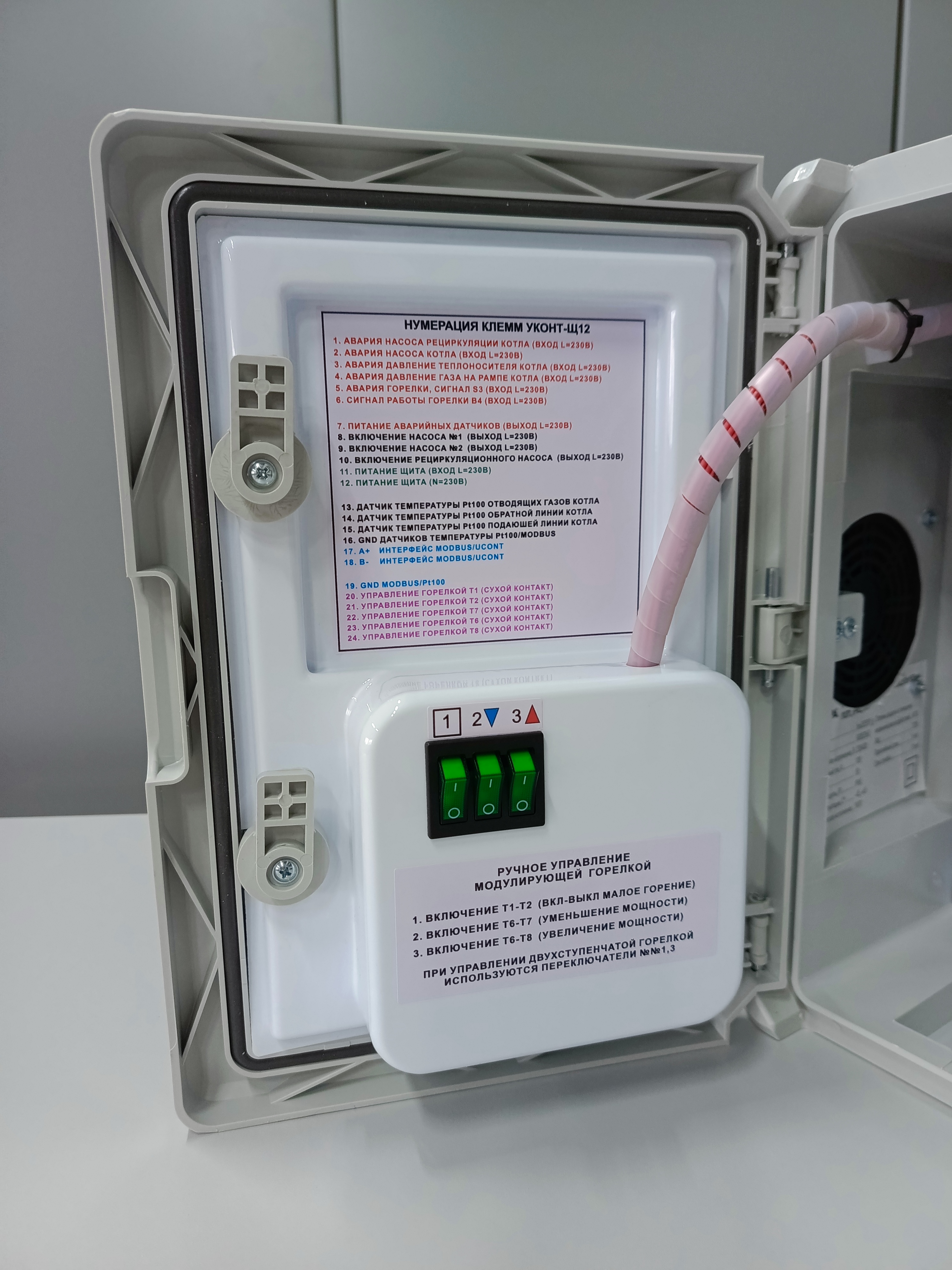К щиту "УКонт-Щ12" в целях безопасной работы котла необходимо подключить термостатический пульт котла "УКонт-Термо". Переключение управления с пульта на щит происходит переключателем с внутренней стороны дверки щита.