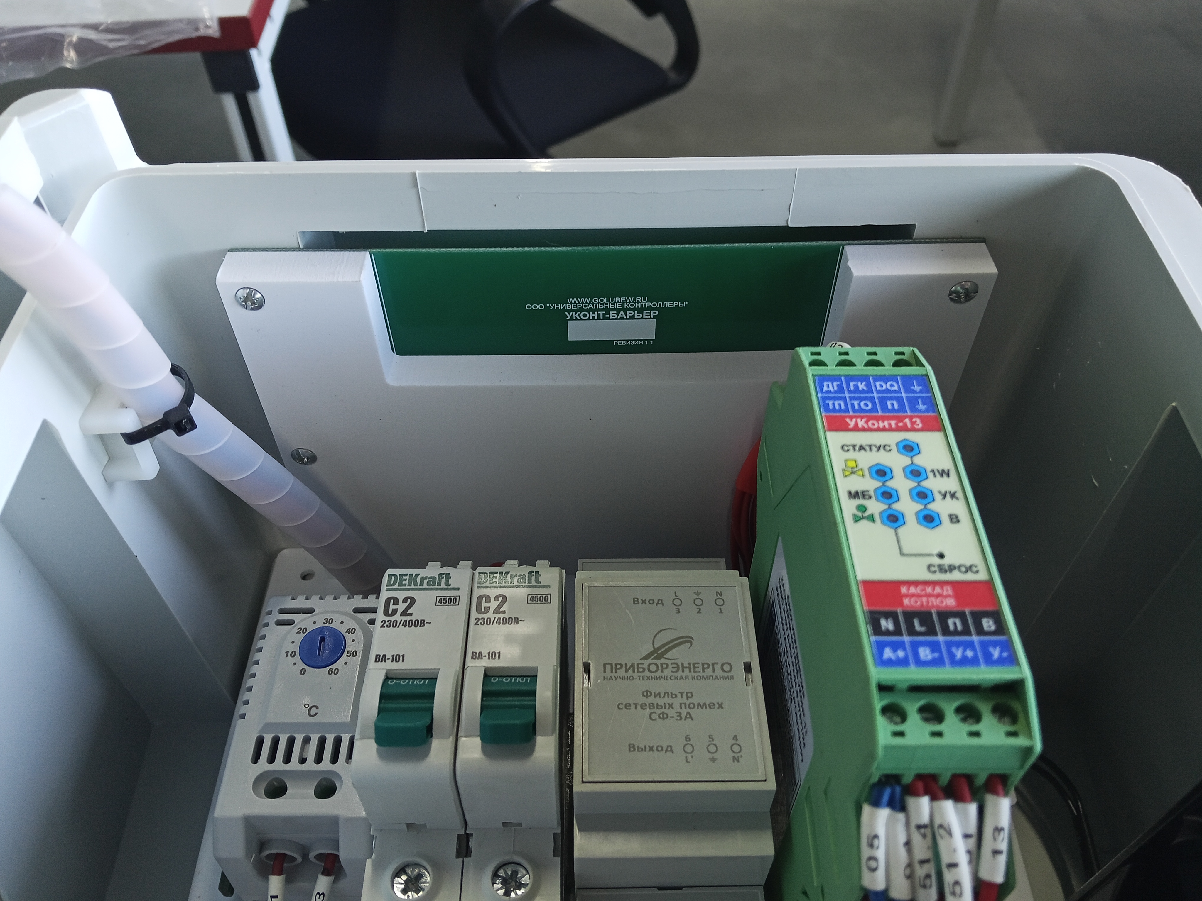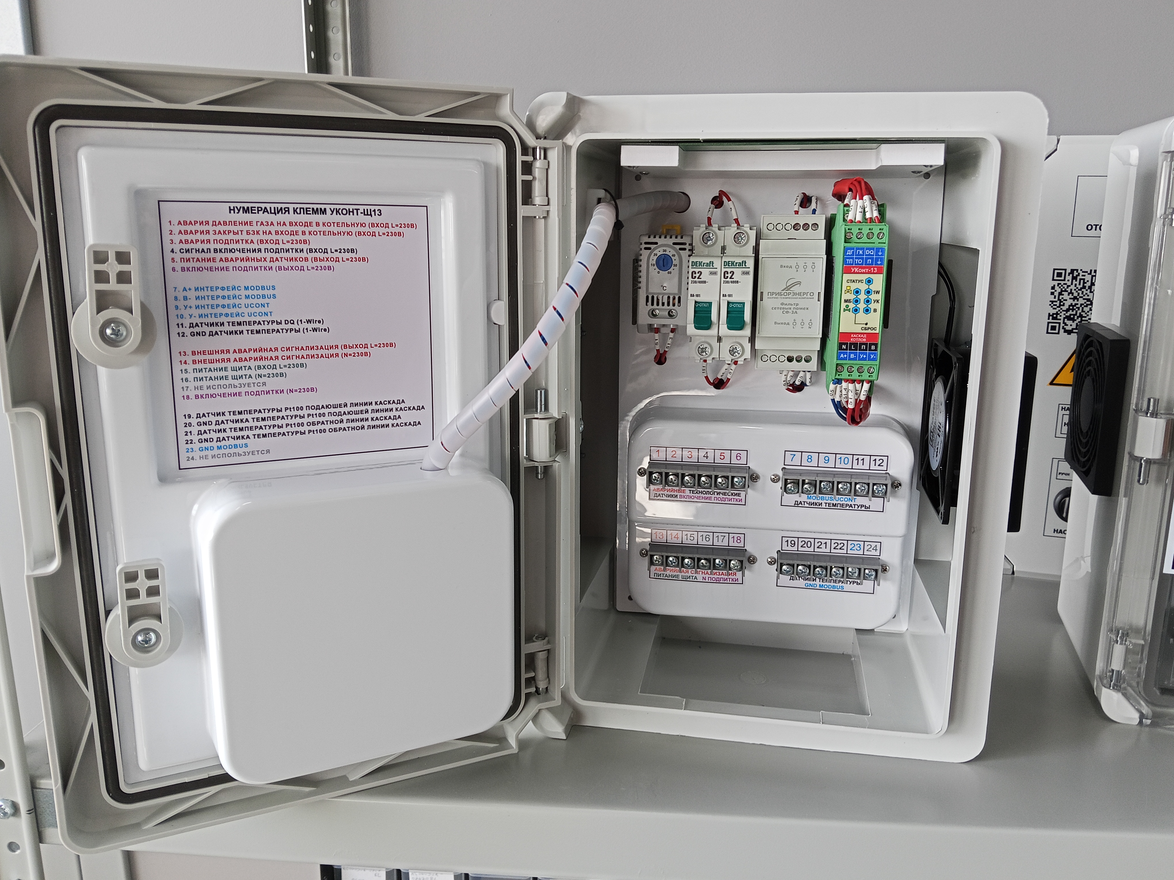 При получении аварийных сигналов, контроллер "УКонт-13" действует по алгоритмам максимальной безопасности. Например, при аварии БЗК (закрыт газовый клапан на входе в котельную), автоматика щита останавливает все котлы, что-бы они не вышли в аварию из-за отсутствия газа.